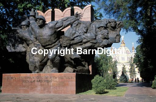 Part of the war memorial in Panfilov Park. The full name of the park is ‘Park Named after the Twenty Eight Panfilov Heroes’. Almaty, Kazakhstan. July 2002.