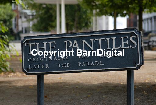 Sign saying 'The Pantiles' originally The Walks later The Parade'. The Pantiles , Royal Tunbridge Wells, Kent, UK. 07 August 2006.