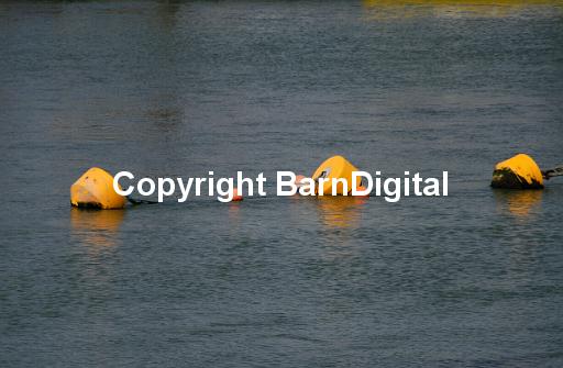 Yellow buoys for mooring fishing boats in the estuary of the River Adur. Shoreham, Sussex, UK. 08 August 2006.
