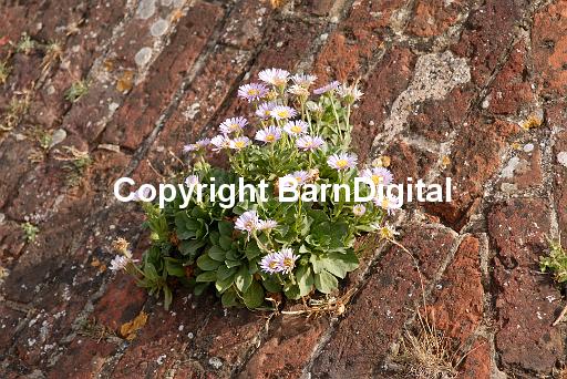 An Erigeron plant, a garden escapee, grows on a brick roofed building at Shoreham Fort . Shoreham, Sussex, UK. 08 August 2006.