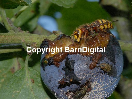 yellow Wasp sting six legged science rotten protective colouration plum nature mould MIchaelGrantImages Michael Grant juice Insecta Insect Hymenoptera fruit eye eat devour compound eye colouration coloration brown big BarnDigital Barn Digital Apocrita