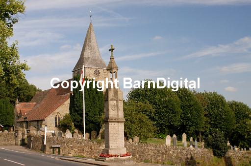St Bartholomew's parish church, Burwash, has a tower dating from the twelfth century. The Burwash war memorial is in the foreground. Burwash, Sussex, UK. 15 August 2006.