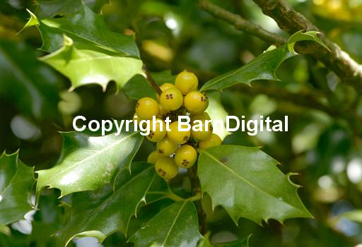 Unripe berries of Holly (Ilex aquifolium). As soon as these ripen and turn red the berries will be eaten by birds who then disperse the seeds in their droppings. Bedgebury Forest, Kent, UK. 19 August 2006