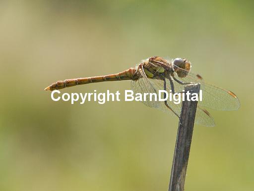 Female Comon Darter dragonfly (Sympetrum striolatum) rests on a stick. Bedgebury Forest, Kent, UK. 19 August 2006.