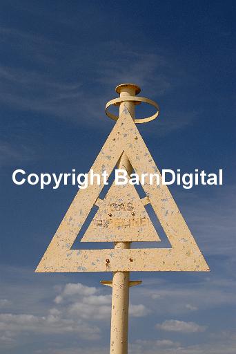 Ancient yellow, corroded, triangular warning mark facing out over the Solent with very feint writing 'Gas Pipeline'. Lepe, New Forest National Park, Hampshire, England, UK. 08 September 2006.