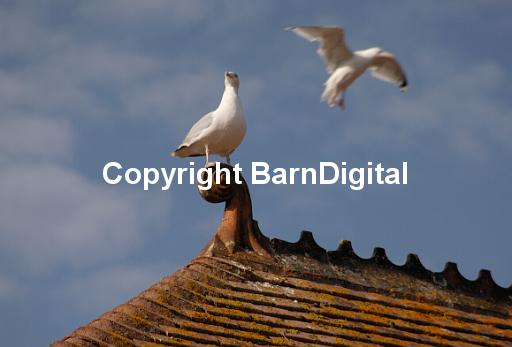 aves avian avine Barn Digital BarnDigital beak bird blue building feather fly gull Gull family Laridae Michael Grant Images MIchaelGrantImages red ridge roof sea tile two white wing