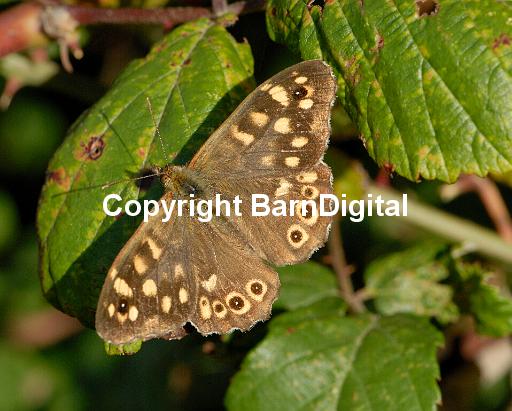 A Speckled Wood butterfly (Pararge aegeria) rests with open wings on blackberry leaves. Hugh Town, St Mary's, Isles of Scilly, England, UK. 14 September 2006.