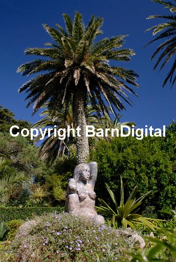 Statue of Gaia, the Earth Mother, beneath a palm tree on a bright summer day with a blue sky in Tresco Abbey Gardens. Tresco, Isles of Scilly, UK. 15 September 2006.