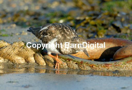 A Turnstone (Arenaria interpres) in winter plumage feeding in the mud and stones and maritime bits and pieces of St Mary's harbour. St Mary's, Isles of Scilly, UK. 16 September 2006.