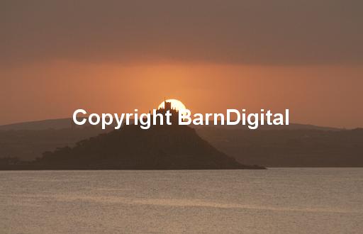 St Michael's Mount: Benedictine priory and castle. The island and buildings are silhouetted against the rising sun and morning sky. Viewed across Mounts Bay from Penzance. Penzance, Cornwall, England, UK. 19 September 2006.