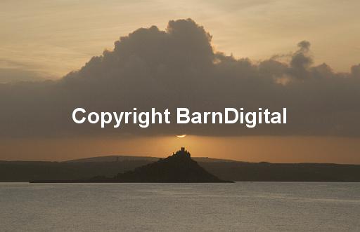 St Michael's Mount: Benedictine priory and castle. The island and buildings are silhouetted against the rising sun and morning sky. Viewed across Mounts Bay from Penzance. Penzance, Cornwall, England, UK. 19 September 2006.