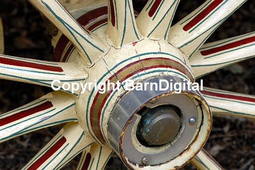 Detail of a light green painted and decorated wooden caravan wheel decorated in Romany style. Romany Life Centre, Cranbrook, Kent UK. 27 September 2006