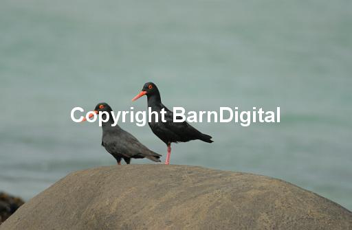 A pair of African Black Oystercatchers (Haematopus moquini) resting on rocks. West Coast National Park, Western Cape, Republic of South Africa. 13 November 2006.