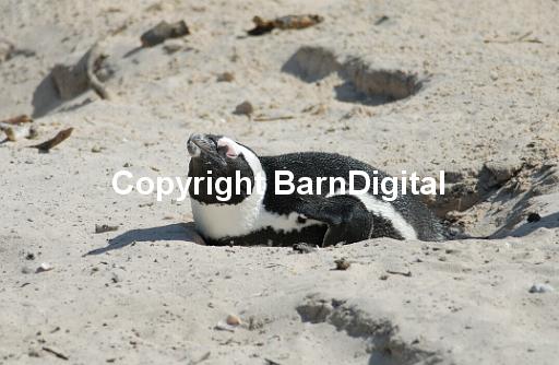 An African or Jackass Penguin (Spheniscus demersus) rests in entrance to its nesting burrow with its eyes closed. Boulder's Beach, Cape Town, Western Cape, Republic of South Africa. 16 November 2006.