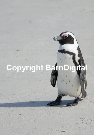 An African or Jackass Penguin (Spheniscus demersus) walking across the sandy beach near its nesting colony. Boulder's Beach, Cape Town, Western Cape, Republic of South Africa. 16 November 2006.