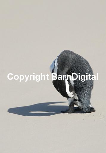 An African or Jackass Penguin (Spheniscus demersus) grooming itself on the sandy beach near its nesting colony. Boulder's Beach, Cape Town, Western Cape, Republic of South Africa. 16 November 2006.
