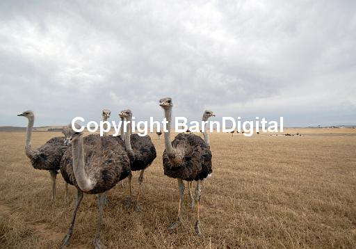Immature farmed Ostrich (Struthio camelus) gather by a road by their field. Near Bredasdorp, Western Cape, Republic of South Africa. 18 November 2006.