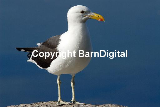 A black and white Cape Kelp Gull (Larus vetula) stands on a rock. Wilderness Western Cape, Republic of South Africa. 21 November 2006.