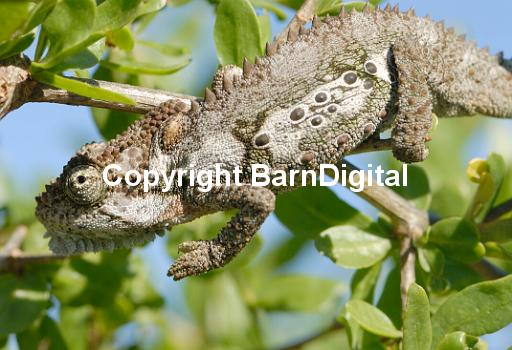 A Dwarf Chameleon (Bradypodion species) stands still in a bush watching for insect prey. Addo Elephant National Park. South Africa. 26 November 2006.