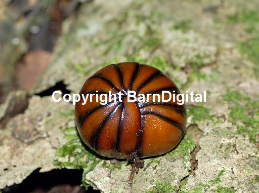 A tan coloured Pill Millipede Order Sphaerotheriida with twelve body segments. This arthropod is the size of a golf ball when it is rolled up. Mbotyi, Lusikisiki, Eastern Cape, Republic of South Africa. 03 December 2006