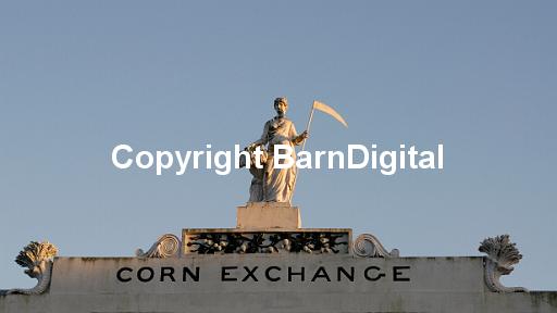 The facade of the old corn exchange, originally a Georgian theatre, is topped by a statue of Ceres, the Roman goddes of cereals, complete with scythe and a sheaf of wheat. Other decorations include a hop bine and cornucopia spilling wheat . The Pantiles, Tunbridge Wells, Kent, England, UK. 17 December 2006.