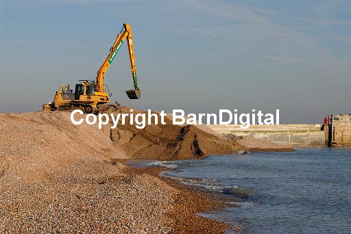 A yellow hydraulic digger digging shingle from the beach at the mouth of the River Rother. The shingle has been washed along the beach of Rye Bay by tides, currents and storms and is being moved back by truck. . Rye Harbour, Rye, Sussex, England, UK. 07 February 2007.