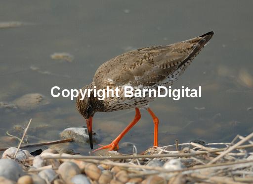 A Redshank (Tringa totanus) searches for invertebrates among the stones on the edge of a shallow lake at Rye Harbour Nature Reserve. Rye, Sussex, England, UK. 16 April 2007
