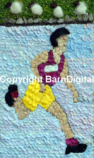 A picture made from flower petals and other natural materials as part of a traditional well dressing in Hayfield, Derbyshire. This picture shows a fwll runner. It is a detail from a well dressing celebrating sheepdog trials that shows the traditional importance of sheep to the Derbyshire economy. Hayfield, High Peak, Derbyshire, UK 15 July 2007