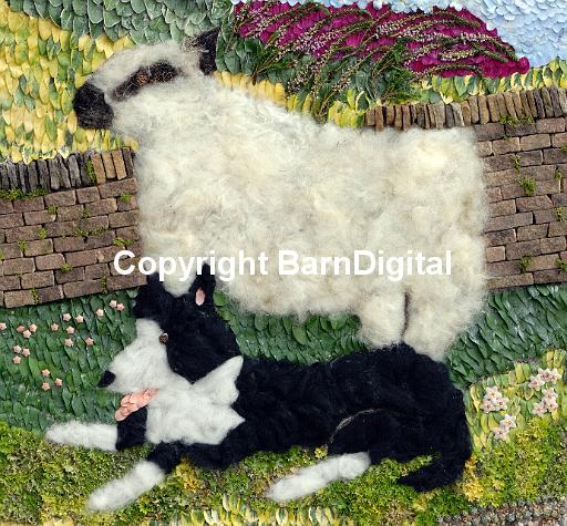 A picture made from flower petals, wool and other natural materials as part of a traditional well dressing in Hayfield, Derbyshire. This picture shows a sheep and a sheepdog . It is a detail from a well dressing celebrating sheepdog trials that shows the traditional importance of sheep to the Derbyshire economy. Hayfield, High Peak, Derbyshire, UK 15 July 2007