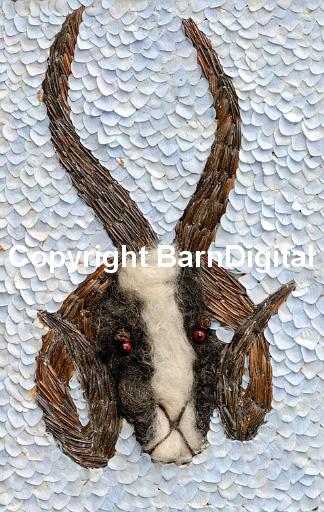 A picture made from flower petals, wool and other natural materials as part of a traditional well dressing in Hayfield, Derbyshire. This picture shows a four horned sheep. It is a detail from a well dressing celebrating sheepdog trials shows a four horned sheep that celebrates shows the traditional importance of sheep to the Derbyshire economy. Hayfield, High Peak, Derbyshire, UK 15 July 2007
