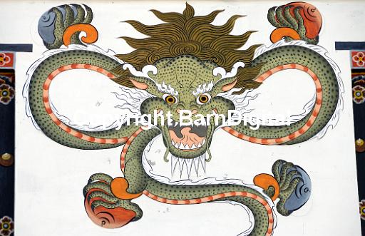 Representation of a dragon painted in traditional Bhutanese style on the wall of a house. This the Bhutanese national symbol, Druk, the thunder dragon. It holds jewels in each of its feet to represent wealth. Paro, Druk Yul, Kingdom of Bhutan. 10 November 2007.