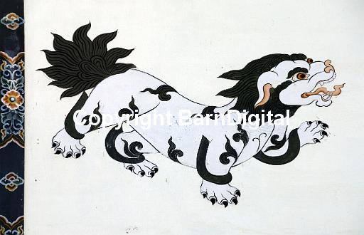 Representation the mythical Snow Lion painted in traditional Bhutanese style on the wall of a house. The snow lion is a white dog-like creature with a black mane, tail and markings. Paro, Druk Yul, Kingdom of Bhutan. 10 November 2007.