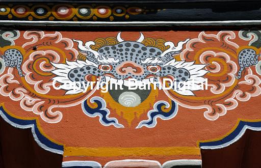 Representation of a dragon painted in traditional Bhutanese style at the top of a concrete column in a new building. This emulates the tradition of painting timbers in traditional wood-built houses. The dragon is the Bhutanese national symbol, Druk, the thunder dragon. Paro, Druk Yul, Kingdom of Bhutan. 10 November 2007.