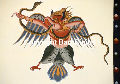 Representation of the immortal Garuda painted in traditional Bhutanese style on the wall of a house. Garuda has the head, wings and lower body of a bird and the torso of a man. Garuda is the enemy of snakes and Nagas and they are usually seen grasped in his beak or claws. Also known as Bjachung, the devourer, Lord of Birds. Paro, Druk Yul, Kingdom of Bhutan. 11 November 2007.