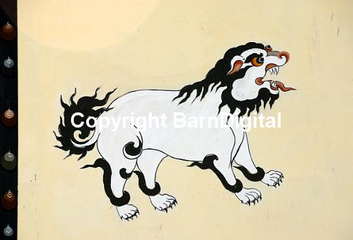 Representation the mythical Snow Lion painted in traditional Bhutanese style on the wall of a house. The snow lion is a white dog-like creature with a black mane, tail and markings. Paro, Druk Yul, Kingdom of Bhutan. 10 November 2007.