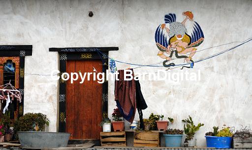 Representation of the immortal Garuda with a snake in his beak painted in traditional Bhutanese style on the wall of a house beside a door. Garuda has the head, wings and lower body of a bird and the torso of a man. Garuda is the enemy of snakes and Nagas and they are usually seen grasped in his beak or claws. Also known as Bjachung, the devourer, Lord of Birds. Paro, Druk Yul Kingdom of Bhutan. 10 November 2007.