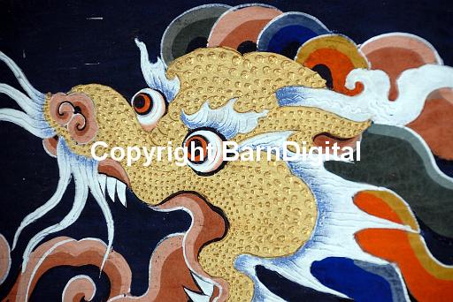 Representation of a dragon painted in traditional Bhutanese style. This the Bhutanese national symbol, Druk, the thunder dragon. Paro Dzong, Druk Yul, Kingdom of Bhutan. 10 November 2007.