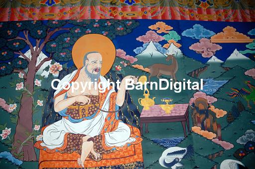 A painting in traditional Bhutanese style shows a benevolent contemplative sage. The picture is full of allegorical meaning and auspicious Buddhist symbolism relating to a long life, the six symbols of longevity. It originates in Chinese and Tibetan buddhist art. Paro Dzong, Druk Yul, Bhutan. 10 November 2007