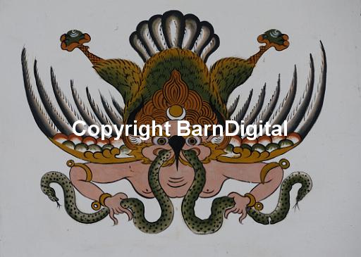 Representation of the immortal Garuda with a snake in his beak painted in traditional Bhutanese style on the wall of a house. Garuda has the head, wings and lower body of a bird and the torso of a man. Garuda is the enemy of snakes and Nagas and they are usually seen grasped in his beak or claws. Also known as Bjachung, the devourer, Lord of Birds. Paro, Druk Yul Kingdom of Bhutan. 11 November 2007.