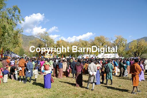 Crowds of Bhutanese in national dress watching the events at the Paro festival. Paro, Bhutan. Druk Yul. 11 November 2007