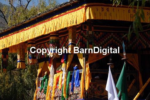 Tthe brightly decorated VIP grandstand at the Paro festival. Paro, Bhutan. Druk Yul. 11 November 2007