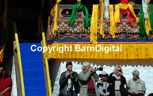 European Tourists armed with cameras lined up under the brightly decorated VIP grandstand at the Paro festival. Paro, Bhutan. Druk Yul. 11 November 2007