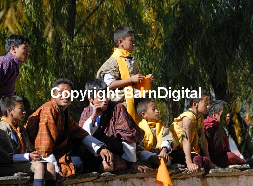 Boys and young men sitting on a wall backed by willow trees watch the events in the Paro festival. They are all wearing bhutanese national dress the gho. Paro, Bhutan. Druk Yul. 11 November 2007