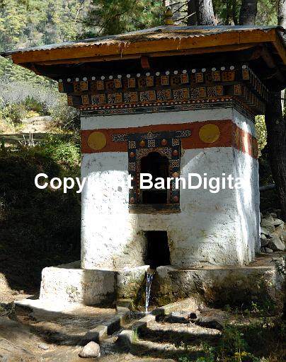 A small decorated building housing a water driven prayer wheel on the path to Paro Taktshang Goemba, the Tiger's nest. Paro Taktsang Bhutan, Druk Yul. 11 November 2007