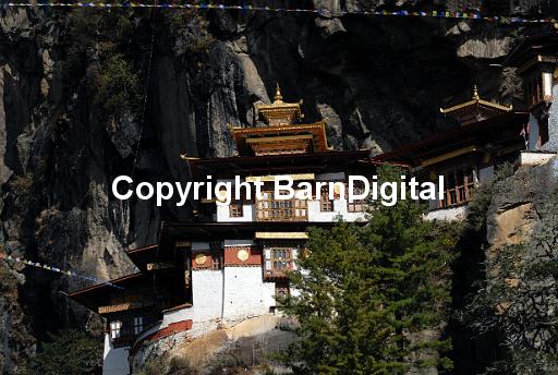 Paro Taktsang Goemba, monastery, know as the Tigers Nest is perched precariously half way up a mountain side cliff. Paro Taktsang Bhutan, Druk Yul. 11 November 2007