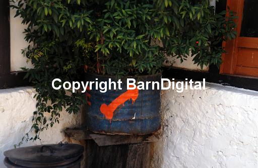 Crude painting of a penis on a plant pot outside the rest house on the path to Paro Taktshang Goemba the Tiger's nest.This is seen as a sign of wealth and good fortune and is seen on many houses in eastern Bhutan. Paro Taktsang Bhutan, Druk Yul. 11 November 2007