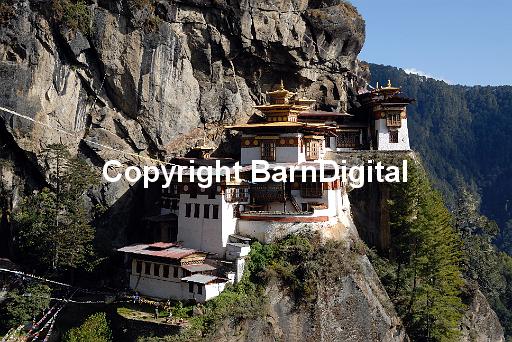 Paro Taktsang Goemba, monastery, know as the Tigers Nest is perched precariously half way up a mountain side cliff. Paro Taktsang Bhutan, Druk Yul. 11 November 2007