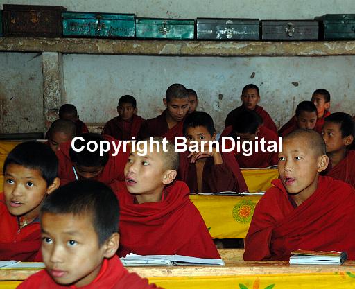 Attentive young monks in class at the state monastic school Dechen Phodrung Monastery.. Thimpu, Druk Yul, Bhutan. 13 November 2007