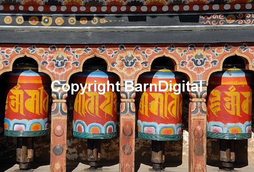 A row of four brightly painted prayer wheels at the state monastic school Dechen Phodrung Monastery. Thimpu, Druk Yul, Bhutan. 13 November 2007
