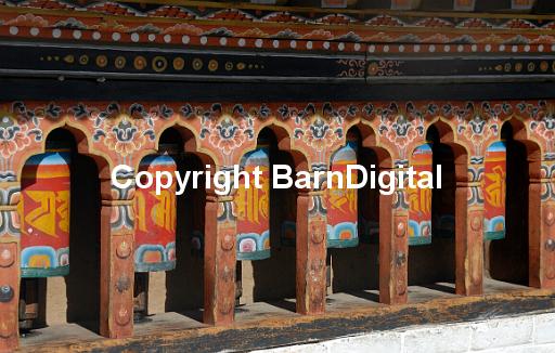 A row of brightly painted prayer wheels at the state monastic school Dechen Phodrung Monastery. Thimpu, Druk Yul, Bhutan. 13 November 2007